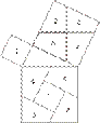 Изображенное на рисунке разложение принадлежит Гутхейлю; для него характерно наглядное расположение отдельных частей, что позволяет сразу увидеть, какие упрощения повлечет за собой случай равнобедренного прямоугольного треугольника.