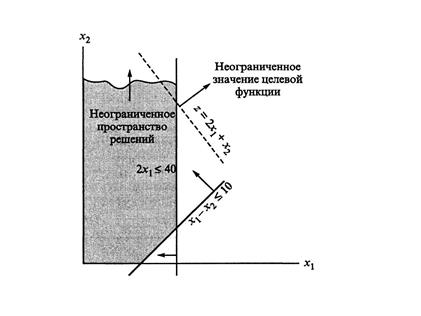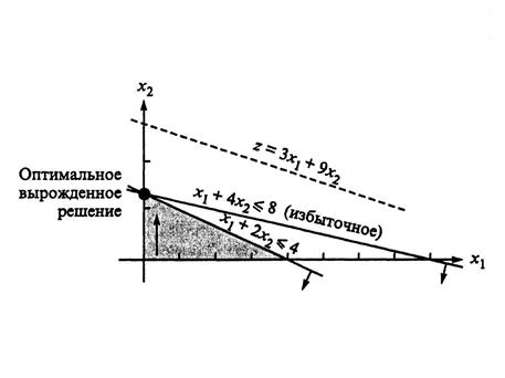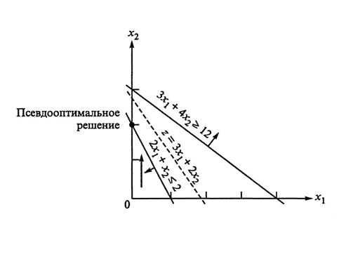 Данные из этой таблицы показывают, что в точке оптимума искусственная переменная Rимеет положительное значение (= 4), что свидетельствует об отсутствии допустимого решения. На рис. 3.4 графически представлена ситуация данной задачи. Алгоритмы симплекс-метода, допуская положительные значения искусственной переменной, по существу, превращает неравенство 3x1 + 4x3 >= 12 в 3x1 + 4x3 <= 12. (Объясните, почему так происходит.) В результате получаем то, что можно назвать псевдооптимальным решением .