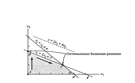 Так как небазисные переменные равны нулю, задача имет множество альтернативных оптимальных решений, находящихся н отрезке AB (x1+ x2 = 4).