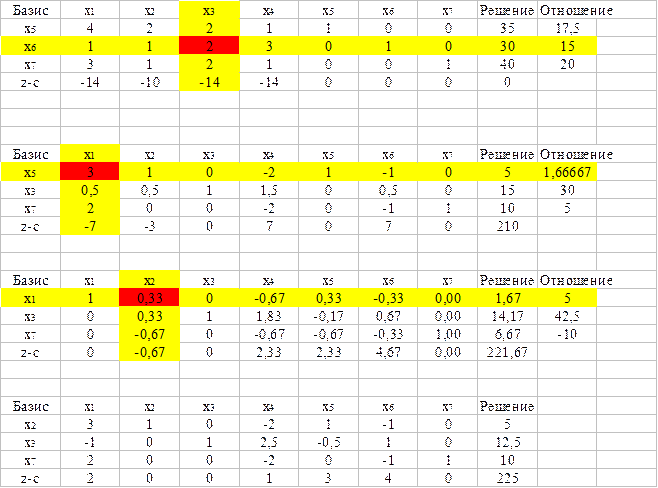 | Базис | x1 | x2 | x3 | x4 | x5 | x6 | x7 | Решение |