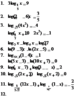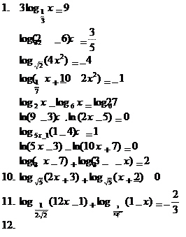 12. lg(3− x ) = lg(5− x 2 ) − lg(x +1) 13. log (103 x − 21− x 2 ) − log (193 x −1) = 0 14. log (2 x 2 − 4 )x − log (22 x + 7) = log (2 x + 2) 15. log2 − x 27 − 7log− x 27 + 6 = 0 16. ⎝16⎠ ⎝ 4⎠ |