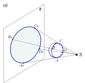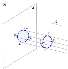 Различают собственные и падающие тени. Собственные тени – это затемненная часть освещенного предмета или это тени, которые получаются на неосвещенной поверхности самого тела. Линия, разделяющая на поверхности предмета освещенную и затененную части называется контуром собственной тени (на рис. 1(а, б) это линия ABCD на поверхности сферы). В свою очередь, данный предмет отбрасывает так называемые падающие тени на плоскости и тела, находящиеся позади него. Внешняя граница падающей тени называется контуром падающей тени (линия A о B о C о D о на плоскости π).