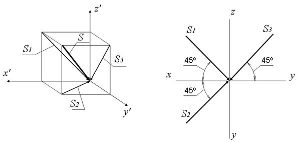 Условно принято контуры теней в ортогональных проекциях строить при стандартном освещении параллельными лучами света. При этом за направление светового луча S обычно принимают диагональ куба, грани которого параллельны плоскостям проекций. При этом наклон луча примерно равен 35°, а направление проекций лучей параллельно диагоналям граней куба и составляет с осями проекций на фасаде и на плане углы 45° (рис. 2).