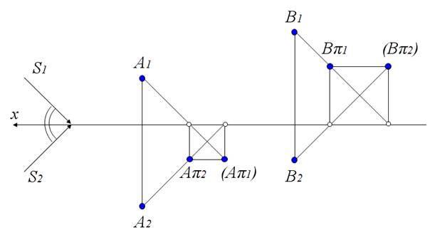 - соединяют действительные тени крайних точек отрезка прямой через точку преломления, т.е. А π 2 КхВ π 1.