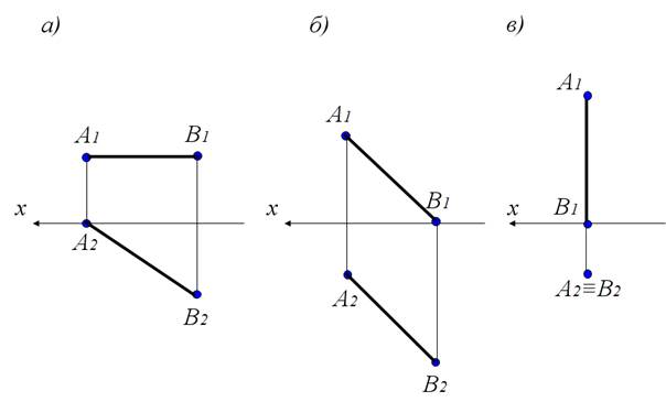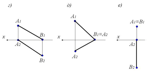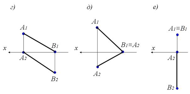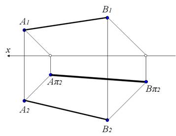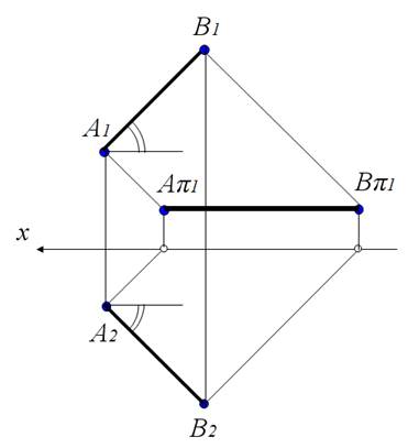 На рис.5 показано построение теней от отрезка прямой общего положения на две плоскости проекций. Построения осуществляют в следующей последовательности: