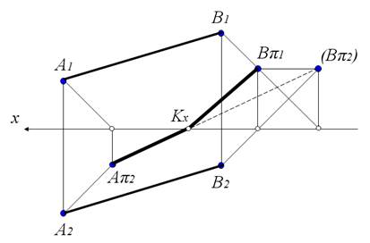 - если построенная тень пересекает ось проекций х , отмечают точку преломления (точка Кх );