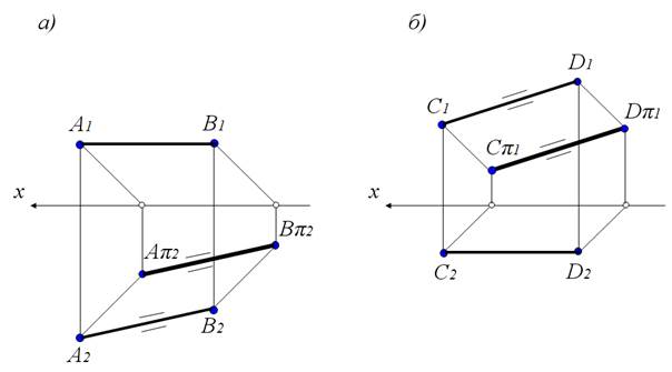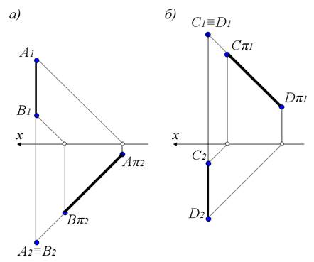 Тень от отрезка прямой, занимающей горизонтально-проецирующее положение, построена в следующей последовательности (рис. 6, а). Строим тени от точек А и В и соединяем их прямой линией – получаем падающую тень А π 2 В π 2 . Построенная тень совпадает с горизонтальной проекцией светового луча. Аналогично строим тень от отрезка прямой CD , перпендикулярного фронтальной плоскости проекций (рис.6, б). Как видно из чертежа, ее тень совпадает с фронтальной проекцией светового луча. Следовательно, можно сделать следующий вывод: если прямая перпендикулярна плоскости проекций, то тень, падающая от нее, совпадает с проекцией светового луча.