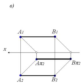 Точка В , напротив, расположена ближе к плоскости π 1 , следовательно, световой луч встретится с плоскостью π 1 раньше, чем с плоскостью π 2 . Построения реальной тени А π 1 и мнимой А π 2 понятны по чертежу.