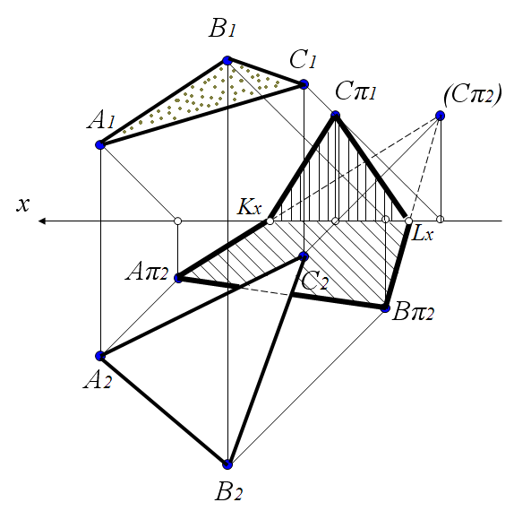 2.2.3 Тень плоской фигуры . Контур падающей тени от плоской фигуры можно рассмотреть как совокупность теней характерных точек контура этой фигуры и соединенных между собой соответствующим образом. Так, например, для построения тени плоского непрозрачного треугольника, необходимо построить тени всех его вершин (рис. 9). Построения нужно вести в той же последовательности, что была рекомендована для построения тени прямой (пункт 2.2). Как видно из чертежа, тень от вершин А и В падают на плоскость π 2 , тень от вершины С – на плоскость π 1 . Тени от сторон АС и ВС падают как на горизонтальную, так и на фронтальную плоскости проекций. Для определения направления теней от этих сторон на горизонтальной плоскости проекций, а также точек преломления Kx и Lx , используют мнимую тень С π 2 .