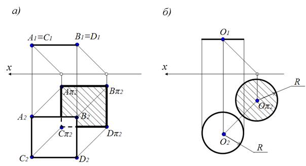 Тень, падающая от плоской фигуры на плоскость, параллельную плоскости этой фигуры, равна самой фигуре. Это правило позволяет значительно сокращать построения. Например, для построения контура падающей тени от квадрата ABCD на плоскость π 2 достаточно построить тень от одной из его вершин, имея в виду, что A 1 B 1 C 1 D 1 = А π 2 В π 2 С π 2 D π 2 (рис. 10, а). Для построения тени в горизонтальной плоскости проекций от круга, расположенного параллельно этой плоскости, достаточно построить падающую тень О π 2 от центра круга О(О 1 ,О 2 ) и из полученной точки описать окружность с радиусом R , равным радиусу данного круга (рис. 10, б).
