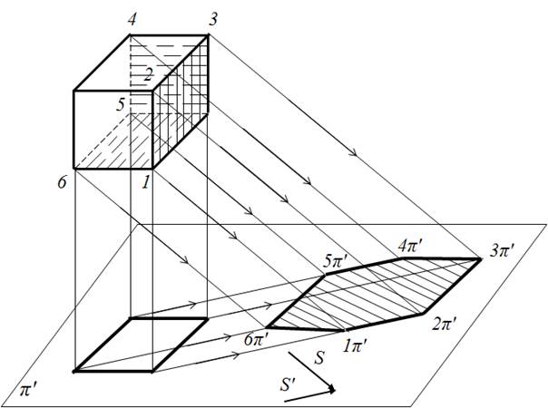 2.2.4 Тени геометрических тел. При построении теней геометрических тел в первую очередь определяется контур собственной тени, т.е. линии раздела освещенных и находящихся в тени частей поверхностей тела. Контур собственной тени определит контур падающей тени. На рис. 11 при принятом направлении светового луча правая, задняя и нижняя грани куба находятся в собственной тени. Остальные грани освещены. Контуром собственной тени является замкнутая линия 1-2-3-4-5-6-1, т которой и строится контур падающей тени.