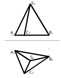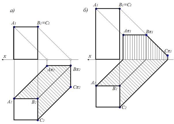 В зависимости от положения плоской фигуры по отношению к направлению световых лучей и по отношению к плоскостям проекций, на ту или иную плоскость проекций может проецироваться освещенная или теневая сторона плоской фигуры. Чтобы определить, какая сторона плоской фигуры, т.е. освещенная или теневая, проецируется на данную плоскость проекций, следует сравнить порядок расположения проекций отдельных точек контура плоской фигуры с порядком расположения их теней. Если направление обхода проекций совпадает с направлением обхода падающей тени, то на проекции видна освещенная поверхность объекта (на горизонтальную плоскость проекций проецируется освещенная сторона треугольника АВС , так как последовательность обозначений А 2 В 2 С 2 совпадает с обозначением контура его тени А π 2 В π 2 С π 2 ). И, напротив, если направление обхода проекций и падающей тени не совпадают, то на проекции видна теневая сторона объекта (неосвещенная поверхность) – на фронтальную плоскость проекций проецируется неосвещенная сторона треугольника АВС (рис. 9) .