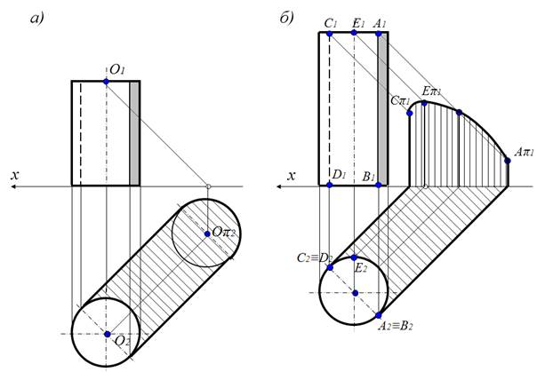 Во втором случае (рис. 13, б) тень от цилиндра частично падает на фронтальную плоскость проекций. Для ее построения следует определить тени А π 2 и С π 2 от точек А и С, а также тени от ряда промежуточных точек контура верхнего основания цилиндра. На чертеже показано по строение тени от точки Е.