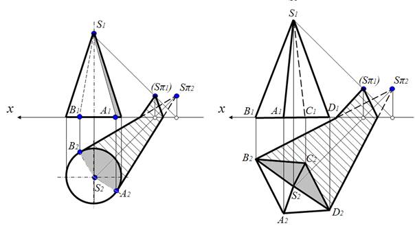 Для построения падающей тени от конуса сначала строят падающую тень от вершины конуса на плоскость его основания ( рис. 14, а ). На чертеже такой тенью является мним ая тень S π 2 . Касательные, проведенные из этой точки к основанию конуса, определяют основания образующих AS и BS , которые и являются контурными линиями собственной тени. Реальная тень от вершины конуса падает в данном случае на фронтальную плоскость проекций.
