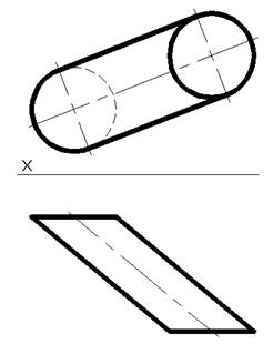 Тень от цилиндра. Вначале строится падающая тень от верхнего основания цилиндра (рис. 13, а). Касательными прямыми соединим ее с нижним основанием. Получим контур падающей тени цилиндра. Касательные прямые являются падающими тенями от прямых образующих цилиндра, определяющие контур собственной тени.