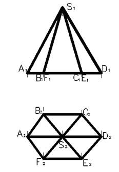 Рассмотрим построение тени от точки A , расположенной в 1 четверти пространства, при заданном направлении светового луча (рис.3). Тень от точки на плоскость проекций определяется как след светового луча, проведенного через данную точку, поэтому рассматриваемый способ построения теней называется способом следа луча . Тень от точки окажется на той плоскости проекций, которую световой луч встретит раньше. На рис.3 световой луч S , проведенный через точку А , встречается с плоскостью π 2 раньше, чем с плоскостью π 1 . Точка А π 2 для луча S является горизонтальным следом, а для точки А , через которую проходит этот луч, - тенью ее на плоскость проекций π 2 . Аналогично, точка А π 1 для луча служит фронтальным следом, а для точки А – тенью на плоскость π 1 . Из этих двух теней первая А π 2 будет реальной, действительной, вторая – мнимой. Тень от точки на плоскость π 2 реальна потому, что световой луч пересекает плоскость π 2 раньше, чем π 1 . Для удобства условимся обозначать мнимую тень в круглых скобках.