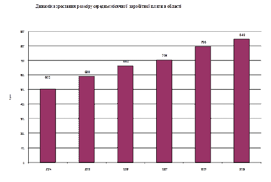 Темпи зростання середньомісячної заробітної плати в господарському комплексі області вищі середніх по Україні. Зокрема, середньомісячна заробітна плата у 2009 році зросла проти рівня 2004 року майже у 4 рази.