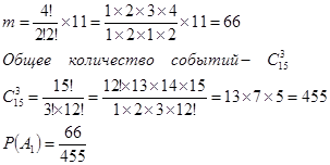 Событию А (герб появляется два раза) соответствуют три случая — (Г, Г, Ц), (Г, Ц, Г) и (Ц, Г, Г), m =3
