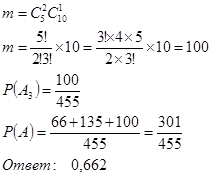 3. Из урны, содержащей 4 белых, 6 красных и 5 черных шаров случайно извлекли 3 шара. Найти вероятность того, что два из них одного цвета