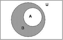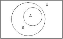 Для наглядного представления множеств используют диаграммы Эйлера-Венна. В этом случае множества обозначают областями на плоскости и внутри этих областей условно располагают элементы множества. Часто все множества на диаграмме размещают внутри прямоугольника, который представляет собой универсальное множество U. Если элемент принадлежит более чем одному множеству, то области, отвечающие таким множествам, должны перекрываться, чтобы общий элемент мог одновременно находиться в соответствующих областях. Выбор формы областей, изображающих множества на диаграммах, может быть произвольным (круги, внутренности эллипсов, многоугольники и т.п.). Покажем, например, с помощью диаграммы Эйлера-Венна, что множество А является подмножеством множества В:
