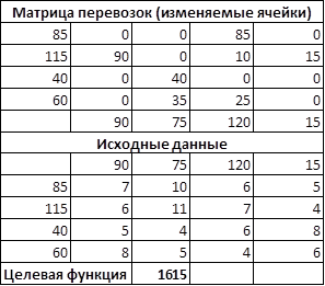 При помощи команды Поиск решений найдем план перевозок, удовлетворяющий условиям задачи и имеющий минимальную стоимость.