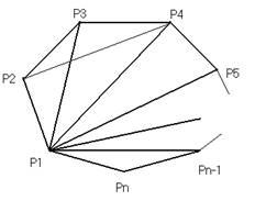 Пусть i=2 – одна группа правильных разбиений, которая всегда содержит диагональ P2 Pn .Число разбиений, входящих в эту группу совпадает с числом правильных разбиений (n-1) угольника P2 P3 …Pn, то есть равно Аn-1 .