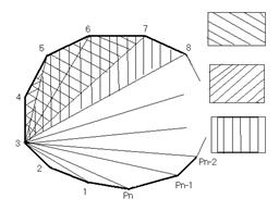 следующим образом: соединяем диагоналями через одну вершину данного n-угольника, причем выделением считается получение последующего a-угольника из предыдущего, используя не менее двух диагоналей. Выделение ведется до тех пор, пока не получится четырехугольник или треугольник (r = 4 или r = 3 (r – остаточный коэффициент)). Назовем каждое такое выделение циклом и введем величину, которая будет “считать” их (d). Для каждого d существует 2d+1 многоугольников, первый многоугольник для данного d ,будет (2d+1 +1)-угольником. Для первой половины (для данного d) многоугольников r = 3, для второй - r = 4. Последним многоугольником, для которого r = 3 будет (3×2d )-угольником. Окончательно получаем: r = 3, если nÎ[2d+1 +1; 3×2d ], в противном случае r = 4. За каждый цикл, если проводить дополнительные диагонали, будет добавляться по 2 пересечения и через d циклов число пересечений достигнет максимума в полученном данным способом разбиении. Обозначим это число буквой k.