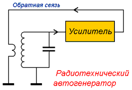 Схема содержит колебательный контур. При наличии в нем колебаний переменное напряжение поступает на вход усилителя, а усиленный сигнал через цепь обратной связи "подталкивает" в нужной фазе колебания в контуре -без этого они были бы затухающими. При правильном знаке коэффициента передачи цепи обратной связи, начиная с некоторой величины коэффициента усиления, возникают автоколебания - колебательный процесс, амплитуда и частота которого определяются самой системой и не зависят от начальных условий.