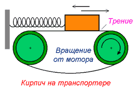 Механическая автоколебательная система, условием функционирования которой служит наличие падающего участка в зависимости силы трения кирпича о ленту транспортера от скорости.