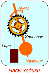 Самая древняя автоколебательная система - маятниковые часы. Гиря на ниточке (цепочке) стремится вращать зубчатое колесо (храповик). При колебаниях маятника анкер цепляет за зубец, и вращение приостанавливается, но в результате маятник получает толчок, компенсирующий потери энергии из-за трения. Потенциальная энергия гири, которая постепенно опускается, расходуется на поддержание незатухающих колебаний.