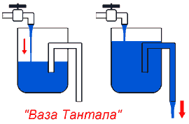 Система работает так: сначала вода наполняет резервуар, отводная трубка наполнена воздухом, и вода не вытекает. Когда вода покроет трубку, она начинает вытекать. При этом действует эффект сифона - вытекание прекратится только тогда, когда уровень воды в резервуаре упадет до нижнего обреза трубки, и в нее попадет воздух. Скорость вытекания через трубку должна быть больше, чем скорость поступления воды в резервуар из крана.
