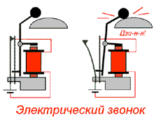 Электромеханическая автоколебательная система. Когда электрическая цепь замкнута, электромагнит притягивает железную деталь с молоточком, ударяющим по звонку, и разрывает цепь. После этого система возвращается в исходное положение, и процесс повторяется.
