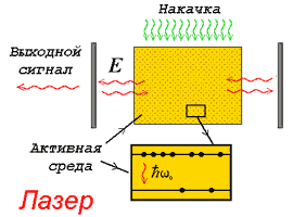 Тем или иным способом, например, посредством облечения некогерентным светом от мощной лампы (накачка), в активной среде создается инверсная заселенность - большая часть атомов располагается на верхнем квантовом энергетическом уровне. Если в резонаторе, образованном двумя зеркалами, присутствует излучение, и частота отвечает частоте перехода между уровнями, атомы переходят с верхнего уровня на нижний. При этом они испускают индуцированное излучение, благодаря которому потери в резонаторе и выходная мощность компенсируются, колебания в резонаторе не затухают, пока действует накачка.