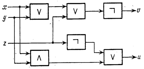 схемы, подсоединяя выходы одних элементов к входам других. Если при таких соединениях избегать возникновения замкнутых контуров (например, подсоединения выхода элемента на один из его собственных входов), то возникает класс схем, называемых обычно комбинационными схемами. Такие схемы находятся в однозначном соответствии с формулами булевой алгебры, так что с их помощью может быть выражена любая система булевых функций. Например, схема, изображенная на рис. 2, реализует систему булевых функций