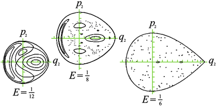 Хенон и Хейлес интегрировали численно уравнения движения для своего гамильтониана, рассчитывая траектории при разных энергиях. Чтобы сразу было видно, по какой — двумерной или трёхмерной — поверхности в четырёхмерном фазовом пространстве проходит та или иная траектория, они выводили на дисплей координаты точек, в которых траектории пересекают плоскость (q2, p2), в виде графиков на плоскости (q2, p2). Если данная траектория лежит на двумерной поверхности, то точки её пересечения с плоскостью (q2, p2) лягут на некую кривую. Если же траектория свободно «плавает» по всей трёхмерной поверхности или по какой-то её части, то точки пересечения с плоскостью (q2, p2) заполнят некоторую часть плоскости. На рис. 1 показаны такие графики.