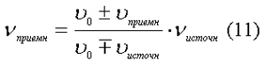 Здесь νисточн - частота волн, испускаемых источником, и νприемн - частота волн, воспринятая наблюдателем. ν0 - скорость волн в неподвижной среде, νприемн и νисточн - скорости наблюдателя и источника волн соответственно. Верхние знаки в формуле относятся к случаю, когда источник и наблюдатель перемещаются друг к другу. Нижние знаки относятся к случаю удаления друг от друга источника и наблюдателя волн.