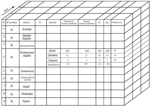 Для учета процессов деградации в приведенной таблице вводится дополнительное измерение, по которому в едином масштабе откладывается время жизненного цикла объекта и таблица становится трехмерной.
