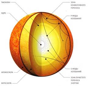 Черные линии — акустические волны сжатия и расширения газа (р-моды). Изменение параметров вещества с глубиной заставляет их многократно возвращаться к поверхности, отражаясь от нее. Серые линии — гравитационные колебания, волны поднятия и опускания газа в собственном гравитационном поле (g-моды). На поверхности они почти не проявляются.