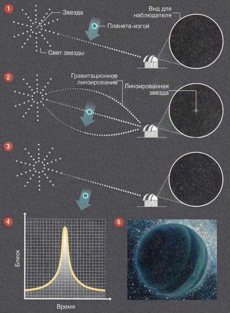 Поскольку сами по себе планеты света не испускают, их поиск представляет для астрономов непростую задачу. В прошлом экзопланеты регистрировались в основном благодаря гравитационному взаимодействию со своими звездами: оказываясь на разных участках орбиты, планета немного «сдвигает» звезду то в одну, то в другую сторону. Такой способ, естественно, не годится для обнаружения планет-изгоев, у которых нет звезд. Вместо него группа Суми использовала эффект гравитационного микро-линзирования. Он основан на том, что гравитация планеты действует подобно линзе и вызывает кратковременные повышения яркости далеких звезд, когда планета в своем движении оказывается в точности на линии, соединяющей Землю со звездой.