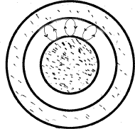 Углекислый газ, возникающий при нагреве жидкой углекислоты радиоактивным теплом, повышает в недрах небесного тела давление и вследствие этого газово-жидкая углекислая смесь расползается все дальше от очага разогрева. Проникая в поры недифференцированного вещества, состоящего из космических осадков, углекислая газово-жидкая смесь под действием повышенного давления около центра небесного тела стремится разойтись дальше от него во все стороны, где давление в порах понижено или отсутствует совсем. Но, проникнув дальше от разогретого центра небесного тела, углекислая смесь охлаждается и пузырьки углекислого газа начинают конденсироваться и сжижаться. Плотность газово-жидкой смеси увеличивается. Увеличивается она вследствие того, что углекислота охлаждается. В результате углекислота начинает постепенно растекаться в разные стороны от вертикального восходящего потока. При этом различные газы, находившиеся в составе углекислой смеси, покидают ее, продолжая двигаться дальше вверх, к поверхности небесного тела, а затем рассеиваясь в мировое пространство. Углекислота же, еще более уплотнившись и потяжелев, начинает многокилометровый путь вниз, к очагу разогрева. Вверх углекислая газово-жид кая смесь перемещается вследствие ее низкой плотности и высокого давления, а вниз жидкая углекислота движется вследствие ее более высокой плотности и гравитационного притяжения к центру небесного тела.