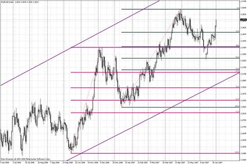 Рассмотрим пример. В паре евро/доллар действует долгосрочная восходящая тенденция. На рисунке 1 основной восходящий тренд обозначен сиреневыми линиями. Мы наблюдали сильное восходящее движение от $1.2480 до $1.3360, после чего это движение затормозилось, и пара вступила в фазу коррекции. Растянув Fibo от $1.2480 до $1.3360, мы увидели, что длина коррекции составила 50.0. Это считается довольно глубокой коррекцией. Фаза коррекции сменилась сильным восходящим движением ($1.2860-$1.3680). Далее снова последовала нисходящая коррекция. Стоит отметить, что после того, как Вы убедились, что пара вышла из стадии коррекции, уровни Фибоначчи целесообразно удалить. Не стоит загромождать график «старыми» Фибоначчи.