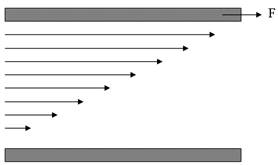 Если верхняя пластина перемещается, жидкость приходит в так называемое ламинарное движение. Каждый слой жидкости движется с некоторой скоростью ν. Каждый слой оказывает силовое действие на нижние пластины и испытывает действие равной силы в обратном направлении. В результате, скорости разных слоев жидкости оказываются не одинаковыми. Профиль векторов скоростей разных слоев жидкости показан на Рис. 1. Так формируется градиент скорости dν/dx.