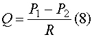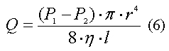 где Q - объемная скорость жидкости (м3/с), (P1 - P2) - различие давления через концы трубки (Па), r - внутренний радиус трубки (м), l - длина трубки (м), η - вязкость жидкости (Па с).