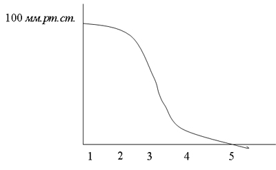 Рис. 2. Среднее давление крови в разных отделах кровеносной системы. 1. Аорта. 2. Артерии. 3. Артериолы. 4.Капилляры. 5. Вены.