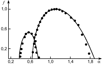Рис. 2. Спектры сингулярностей f (α) показывают, грубо говоря, как часто встречается данное значение критического показателя α. Правая спектральная кривая соответствует критической орбите, изображённой на рис. 1, для системы Рэлея–Бенара с внешним возбуждением при переходе к хаосу по квазипериодическому сценарию. Левая кривая соответствует переходу системы к хаосу по сценарию удвоения периода. |