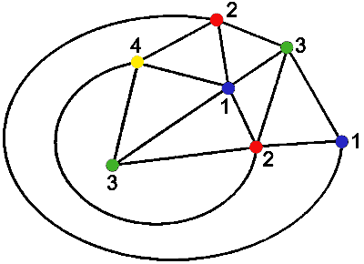 Что такое проблема четырёх красок? Это вопрос из теории графов. Граф — это просто некоторые вершины, которые могут быть соединены между собой рёбрами. Если мы эти вершины сможем нарисовать на плоскости, и рёбрами соединить так, чтобы рёбра между собой не пересекались, получится граф, который называется плоским. Что такое раскраска графа? Мы красим его вершины в разные цвета. Если мы это сделали так, что соседние по ребру вершины всегда разного цвета, раскраска называется правильной. Хочется правильно покрасить граф, использовав как можно меньше различных цветов.