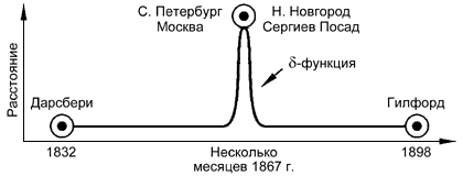 В целом мировую линию Кэрролла вряд ли можно назвать богатой взлётами: его бренная оболочка своим монотонным (чтобы не сказать унылым) существованием как бы компенсировала те удивительные приключения, которые переживал его дух. В тихом провинциальном Оксфорде он провёл большую часть своей жизни, лишь изредка покидая его, чтобы посетить выставку картин или интересный спектакль в Лондоне, провести рождественские каникулы в кругу своих многочисленных сестёр. И лишь однажды, в 1867 году, привычный ритм жизни был нарушен: вместе со своим коллегой преподобным Лиддоном (известным богословом, впоследствии настоятелем собора Св. Павла в Лондоне) Льюис Кэрролл отправился в Россию — на графике виден пик, соответствующий этому событию и похожий на известную математикам дельта-функцию (рис. 2).