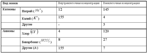Электрические явления в плазматической мембране определяются распределением ионов между внутренней и внешней сторонами мембраны. Из химического анализа известно, что концентрация ионов внутриклеточной жидкости сильно отличается от концентрации ионов во внеклеточной жидкости. Термин "внеклеточная жидкость" имеет отношение ко всем жидкостям вне клеток (межклеточное вещество, кровь, лимфа и т.п.). В таблице представлены концентрации основных ионов в мышечных клетках млекопитающих и внеклеточной жидкости (миллимоли на литр).