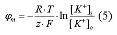 R - универсальная газовая постоянная, T - термодинамическая температура, z - электрический заряд иона, F - постоянная Фарадея, [K+]i и [K+]o - внутриклеточная и внеклеточная концентрации ионов калия соответственно.