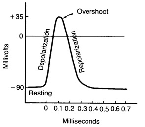 Длительность потенциала действия составляет от 0,5 до 1 миллисекунды в больших нервных клетках и несколько миллисекунд в клетках скелетных мышц. Общая амплитуда - почти 100 - 120мВ, отклонение от нулевой линии - около 30-50мВ.